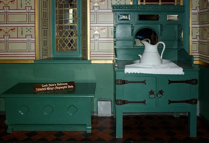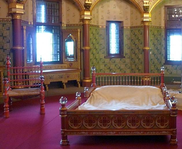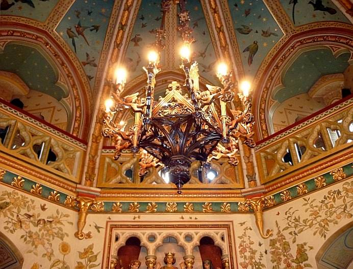 Lady Bute's Bedroom, left to right: Double dome of the bedroom ceiling, with the upper part mirrored; visible here is one of the thin metal ties that cross just above the chandelier. The bedstead was designed after an illustration by Viollet-le-Duc, except for the addition of the crystal balls; the colourful chair, one of a pair in the room, was copied from an original Burges design. Lady Bute's washstand was made for the room by John Starling Chapple, a long-standing and devoted member of Burges's team, in 1891; its towers house the hot and cold water cisterns. Like the chairs, the painted cupboard in the bedroom is a faithful copy of a Burges design.