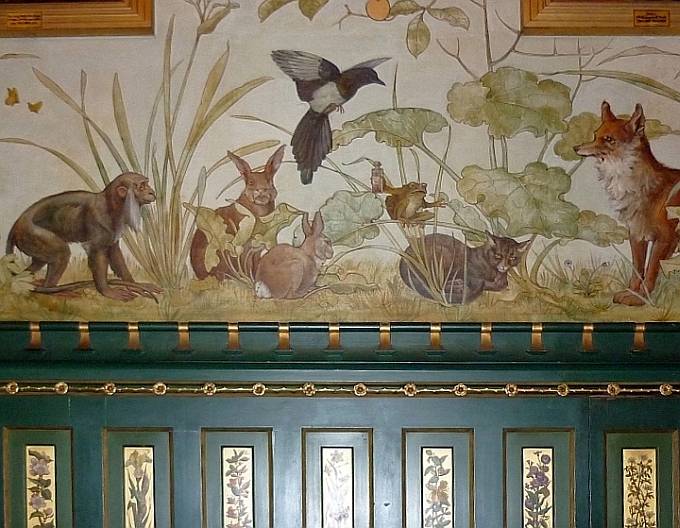 Left to right: Drawing Room ceiling showing the butterfly-embellished stone vault ribs. Another view of the ceiling, showing the minstrels' gallery: notice the heron on the left, flying correctly with its neck tucked in and its legs trailing. Lower part of the mural depicting figures from Aesop's Fables, such as the clever magpie and the "quack frog" (both near centre), by H. W. Lonsdale, with flower panelling beneath.