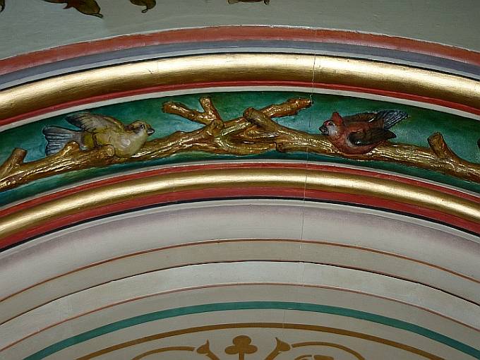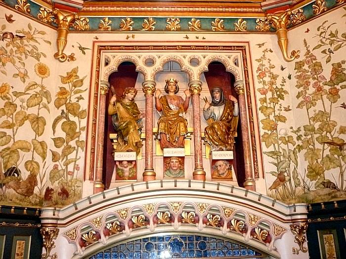 The Drawing Room has been described as the "pièce de resistance of Burges's work at Castell Coch" (McLees 41), and perhaps it is the single most beautiful room that Burges ever created. It is hard to do justice to the effect of its very steeply vaulted ceiling, which rises another two storeys. It has eight highly decorated and gilded stone ribs embellished with different kinds of butterflies, ascending towards a circle at the centre made up of larger butterflies, wing to wing. The ceiling is painted with stars, more butterflies and a variety of birds, from parrots (which Burges particularly loved) to herons. There are butterflies too inside the deep recesses of the gallery. Picking out some of the other motifs in the room, such as the chrysalis and the bird's nest, J. Mordaunt Crook explains that "The theme is Life and Death in Nature," adding, with reference to the portraits hanging round the walls, "Bute and his ancestors float within the flux of time, below the blue sky of eternity" (William Burges and the High Victorian Dream, 282). The architectural work was inspired here as elsewhere by Viollet-le-Duc, in this case most notably by his work at the Château de Pierrefonds and his plans for the Château de Coucy (see McLees 41), and was completed before Burges's death. So too were other important elements of the room. In particular, the chimneypiece with its dramatic reminder of human mortality was designed by Burges and executed as usual by Thomas Nicholls. However, according to David McLees the colour scheme and some of the decorative touches, such as the "softer" murals, completed in the later 1880s, show a dilution of High Gothic by the influence of Godwin and Morris (43). Perhaps so, but the net result is still very "Burgesian."