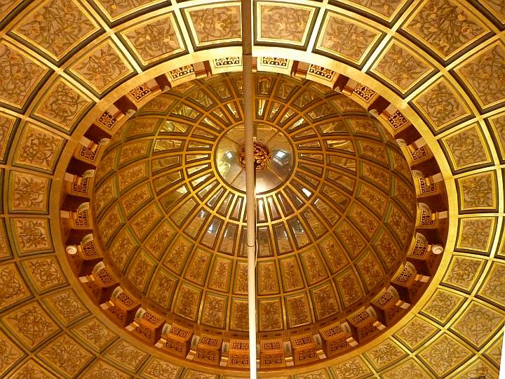 "Lady Bute's circular bedroom is magnificent, set beneath a glorious mirrored dome," writes Matthew Williams (12). The theme here is of the Sleeping Beauty, hence the motif of tangled vegetation seen in the gilded ceiling panels. Again, the room was completed according to Burges's drawings, though with later ideas and trends glimpsed in the style and colours of the painting. For instance, the monkeys round the lowest circle of ceiling panels, which the Marquess considered quite inappropriate, were painted later by the firm of Campbell, Smith & Co. — though note that the firm's founder, Charles Campbell, was also in charge of the painting of the Arab Room, the Octagon staircase and so on at Cardiff Castle (see Crook, William Burges and the High Victorian Dream, figs. 160 and 161, and 157). But fashions do change, and Burges, who remained more faithful to High Victorianism than most of his peers, and who in that respect developed little from one project to another, was no longer there to hold back the tide. There does seem to be some incongruity here, between the exoticism of the Moorish ceiling, chairs and cupboard, and, say, the paler, more dainty Morris-like flower stencilling around the tops of the windows. Again, though, thanks to the glittering ceiling and the eye-catching furniture items, the overall feel is rich, exotic and typical of Burges. As for the medieval French design of the bedstead, Stefan Muthesius writes that Viollet-le-Duc's Dictionnaire du Mobilier Français (1855-8) "must have been a mine of information for Burges, Street and others" (114).