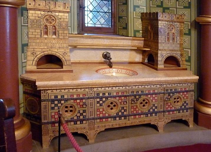 One critic feels that the rooms in Castell Coch are decorated just as lavishly as those of Cardiff Castle, "although maybe more whimsically as befits this occasional retreat," and that "Burges was less pedantic about the scholarly correctness of the interior than he was at Cardiff" (Jones 52). Some of this is questionable. While there are many rich decorative details like those shown above, none of the rooms is quite as overwhelmingly ornamented as, for example, the Winter Smoking Room is at Cardiff Castle. Moreover, Lady Margaret's Bedroom and Lord Bute's bedroom are quite meagrely decorated. The latter was originally expected to be on an upper level of the Keep Tower, but was relegated to the gatehouse as more ambitious plans developed for the vaulted drawing room. But it was perfectly appropriate for its intended occupant, since it has access to the fighting gallery overlooking the bridge, and is just over the winch room with its portcullis. In other words, it is at the very heart of the castle's defences. As for "scholarly correctness," Burges and Bute certainly worked hard on architectural correctness, even excavating the old well at the bottom of the Well Tower and installing a working metal pump, though the plumbing in the castle was actually state-of-the-art for its time, with radiators, cisterns and so on. However, it is true that Burges was "less pedantic" about the interiors of the main rooms, with their mix of medieval and more exotic elements. There are no "fantasy capsules" of the order of Cardiff Castle's Arab Room here (Crook, William Burges and the High Victorian Dream, 278). How much this is due to Burges's early death, and his lack of control over the final effects, is uncertain.