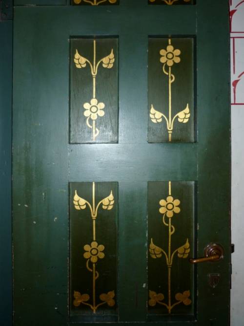 Left to right: Branches and birds in the arch of a doorway. Stencilled panelling on a doorway. Washstand in Lord Bute's Bedroom. Part of the metal pump for drawing water from the well, in the Well Tower.