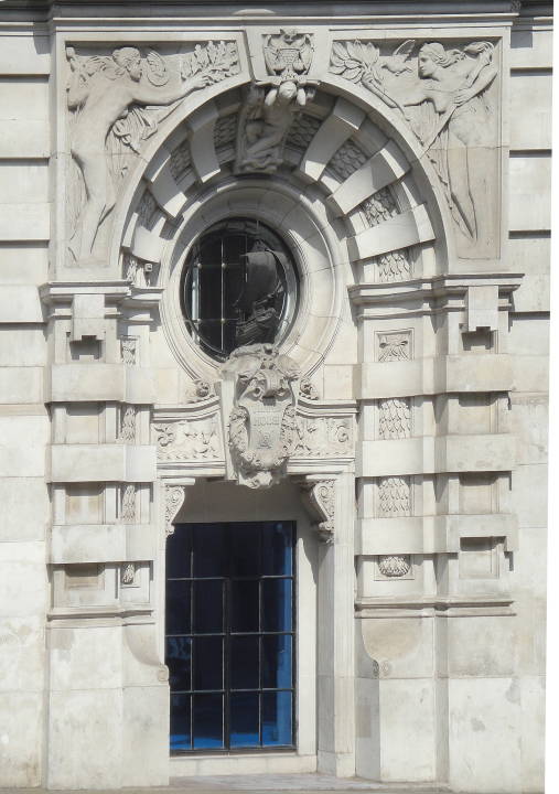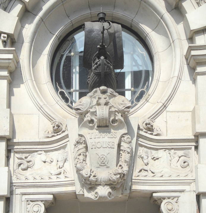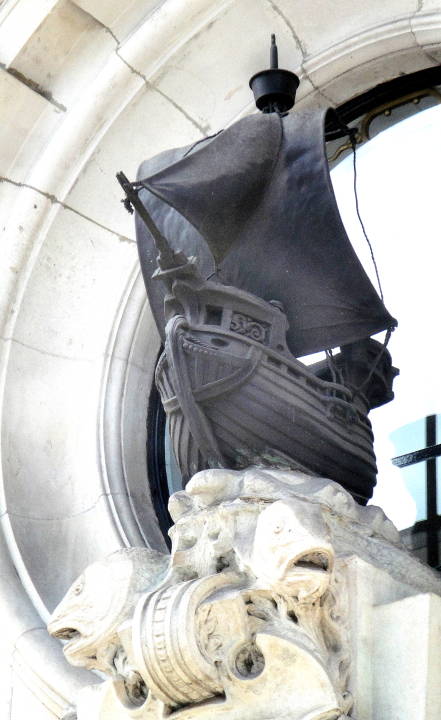 Galleon over Lower Ground-floor Window of the Southern Pavilion by William Bainbridge Reynolds. 1911-12. Bronze, 1m high. Thames House (architect: Stanley Hamp), Upper Thames Street and Queen Street Place, almost to the river. [Click on images for larger pictures.]