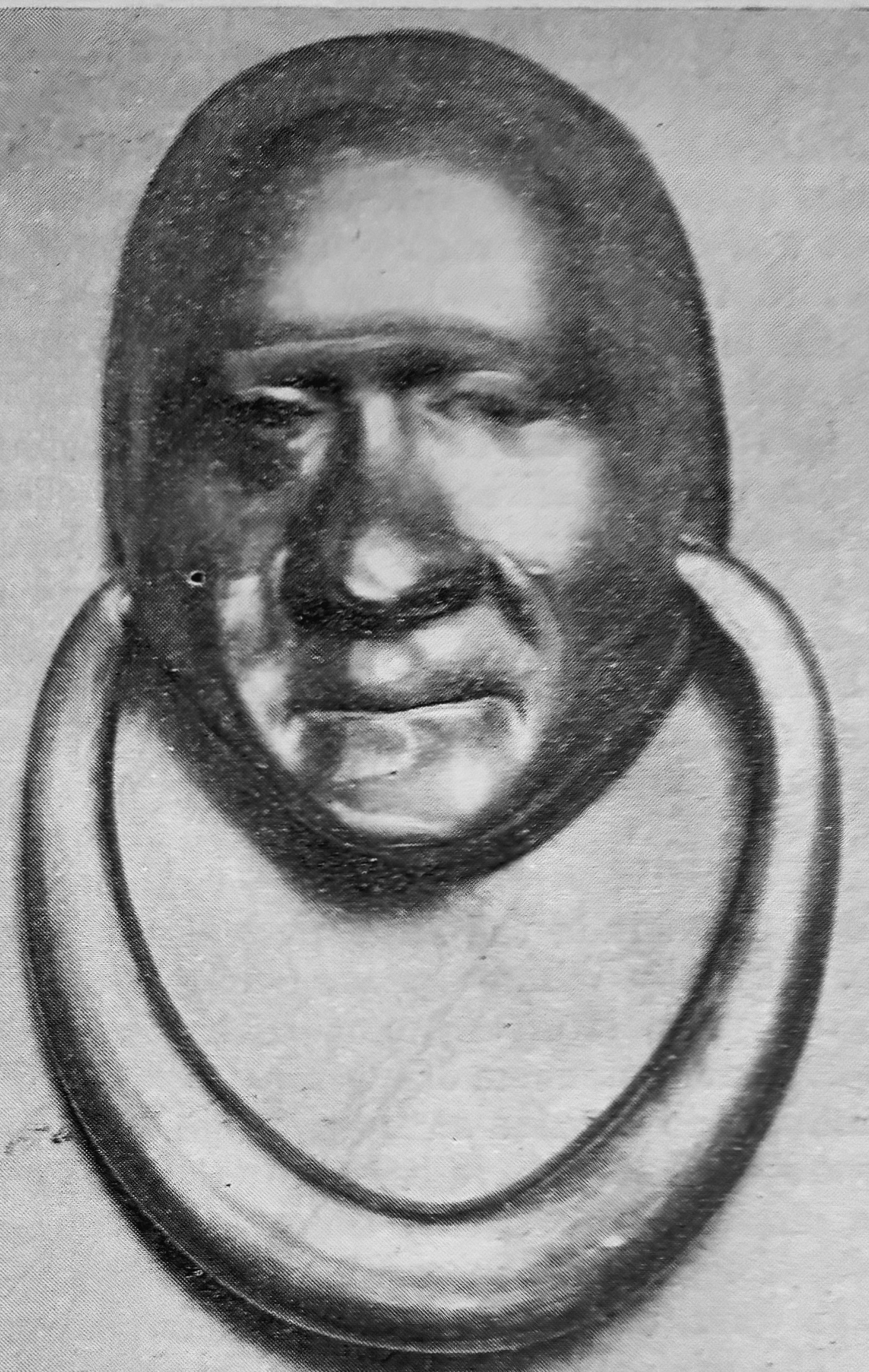 Left: Charles Green's 1924 lithograph, page 29, with a vignetted area of 7.2 cm by 5.5 cm, Scrooge's Knocker. Right: from the October, 1924, Dickensian, The Marley Knocker (brass, before 1840).