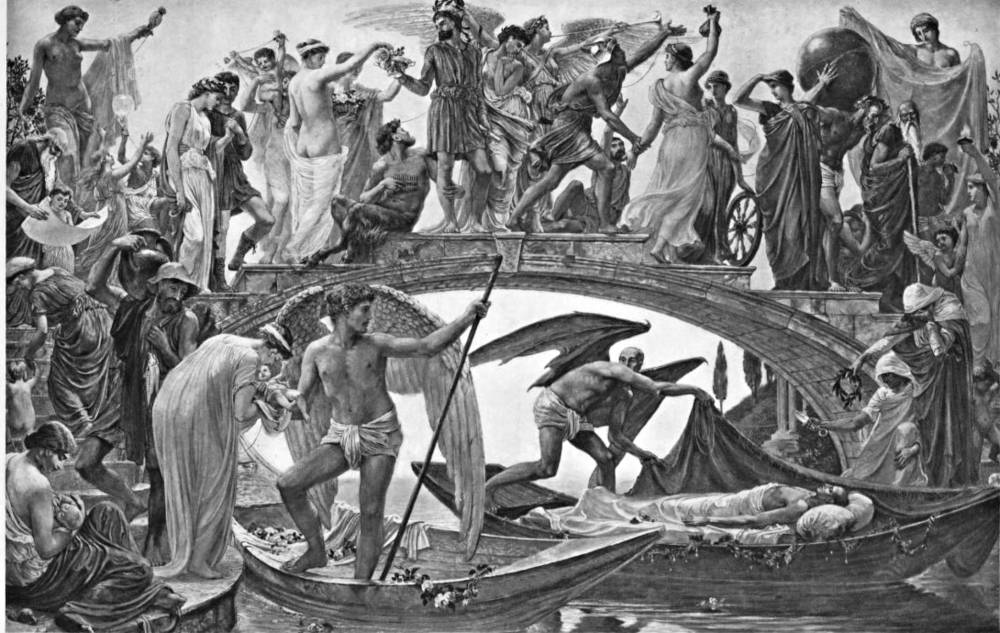 The legend is perhaps not difficult to read, though it is an age that loves not allegory. The thread of life from the staff of Clotho woven into its mystic and complex web by Lachesis, and severed at last by Atropos. The boats of life and of death meeting under the frail bridge. From the one, Young Life disembarking, and climbing the stairs, fostered by father and mother, led and guided and taught by Eld: following its child-like play, till made the sport of Love in the heyday of youth: till the trumpet of Ambition is heard and "the middle of life's onward way" is reached.