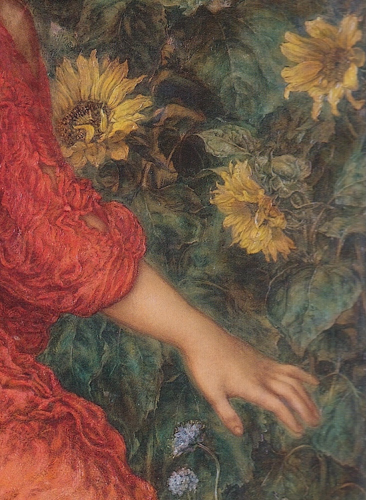This painting was exhibited at the Grosvenor Gallery in 1884, no. 240. The story of Clytie is taken from Book IV of Ovid's Metamorphoses. Clytie was a water nymph who was in love with Apollo, the sun god. Apollo abandoned her because of her jealousy. She withdrew to a lonely place where she pined away with unrequited love, not eating or drinking, but gazing all day at the sun with her face turned constantly on him. Finally her limbs rooted in the ground and became transformed into the stems of a plant, while her face became a sunflower. When the picture sold at Sotheby's in 2006 Christopher Newall commented: "Rooke shows Clytie in the process of transformation from woman to sunflower; the orange colour of her dress suggests still the warmth of Apollo's love, but she appears already to be sinking towards the ground. Her hair is growing wild, while her face will turn into that of a flower, and one which will always follow the course of the sun" (68). Rooke's handling of the orange semi-transparent drapery does not equal the mastery shown by classical painters such as Frederic Leighton, Albert Moore or Lawrence Alma-Tadema and falls in unnatural folds. Clytie is portrayed kneeling on the ground, her arms outstretched, and gazing skywards towards the sun. The background features the sunflowers that Clytie will be transformed into.