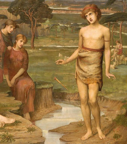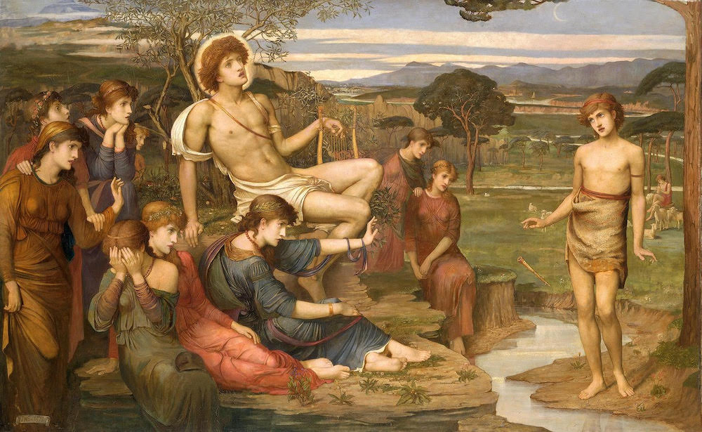 Left: The various expressions of Strudwick's Muses. Right: The vulnerable Marsyas, not at all satyr-like in Strudwick's version, as the flute falls from his hand.
