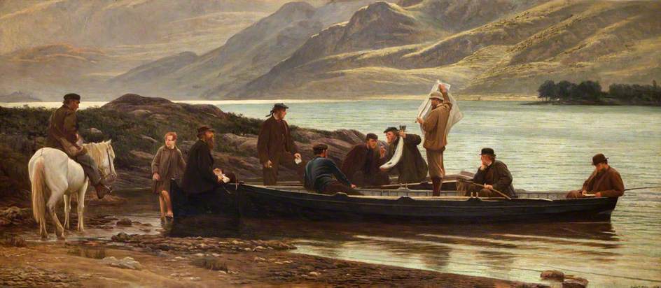Letters and News at the Loch Side, by Henry Tanworth Wells (1828-1903). The date of this work is contested: it is given on Art UK as 1868; but the year of the marriage for which it is said to have been commissioned was 1883 (see Martin). Oil on canvas. H 120 x W 282 cm.(47.2 x 111 inches). Collection: West Highland Museum, accession no. 3457, bequeathed by the executors of Miss M. J. Becher, 1999; on loan to Arisaig House. Image kindly made available via Art UK under the terms of the Creative Commons Attribution-NonCommercial licence (CC BY-NC). [Click on the image to enlarge it.]