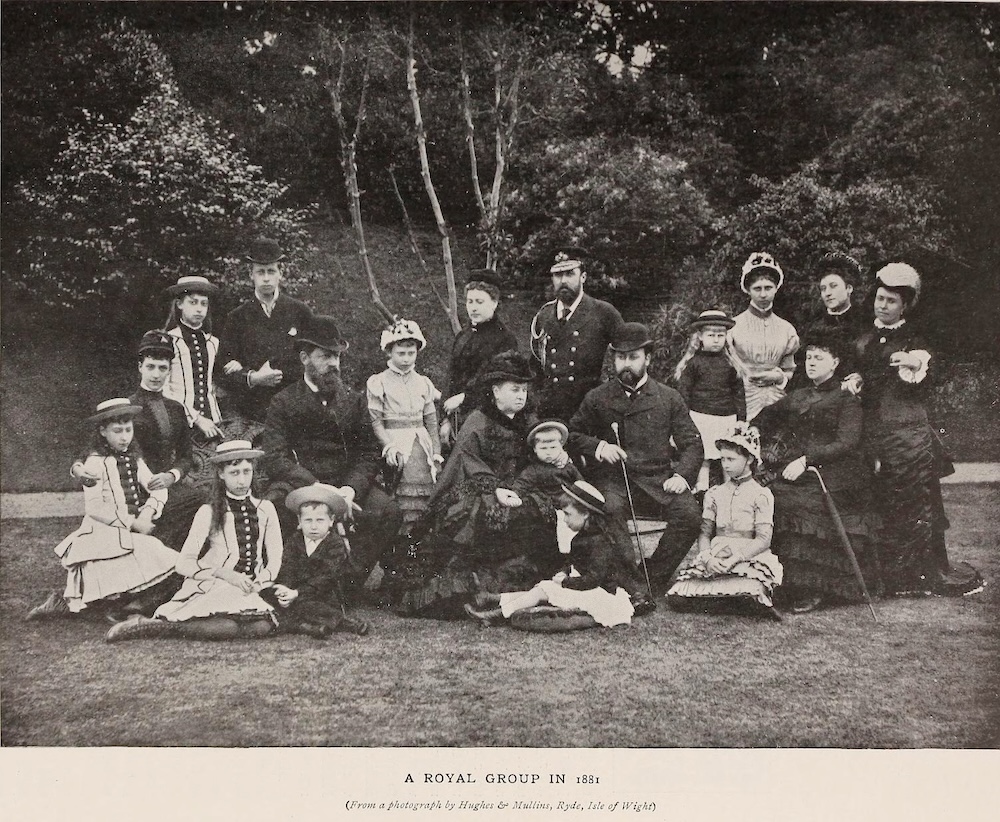 This "royal group" at Osborne in 1881 was first reproduced by J.E. Vincent in his 1902 book about Edward VII, From Cradle to Crown (facing p. 186). On 11 August that year Queen Victoria had noted in her journal, "A fair morning. — Heard from Mr Gladstone. — Had a letter from Philip Coburg [Prince Philip of Saxe-Coburg-Gotha], with the sad details of his dear father's death. — We were all photographed together, in a group, by Hughes, 20, in all, viz: Louise, Beatrice, & I, Bertie, Alix ,& their girls, who had come over on purpose, Fritz, Vicky, Henry & the 3 girls, Affie, Marie, & their children. I held the dear little baby, & Ducky sat at my feet." Vincent's book proved popular, and was reprinted with some additional text after Edward's death, retitled The Life of Edward VII. This is the source of the illustration above (facing p. 213).