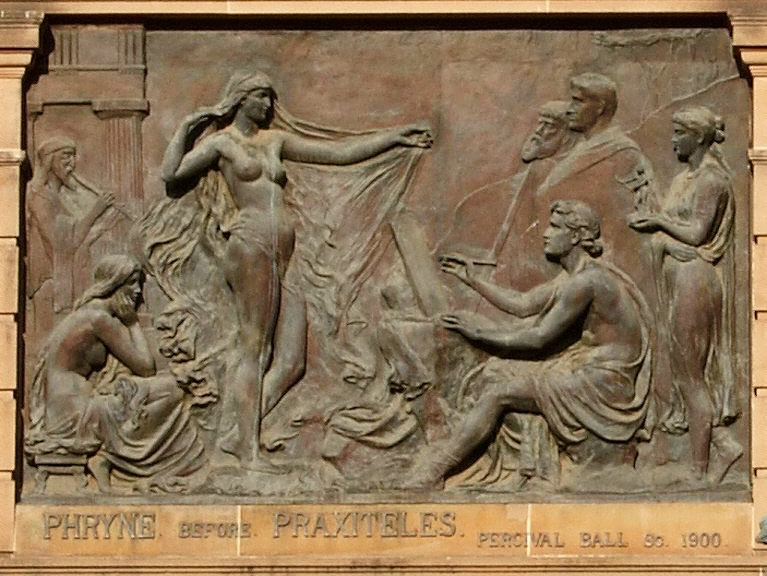 Percival Ball's Phryne before Praxiteles (1898, 1900), the original plaque, intended to epitomize the arts of ancient Greece.