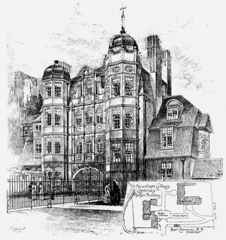 The Pfeiffer Building of 1892. This building was featured later in the periodical Academy Architecture, in a "Review of the Architectural Work of Basil Champneys, B. A.," together with an inset map showing its position (52). As shown on the page, it consists of an impressive four-storey gatehouse housing an entrance archway, with a wrought-iron screen designed later by Champneys himself, in 1893. The Pfeiffer Building's high domed corner turrets are described in the listing text as being in "Dutch Baroque style." Mark Girouard is particularly impressed by the gatehouse: "The Pfeiffer gatehouse is a nice example of the ‘Queen Anne’ method of putting Gothic Revival principles into seventeenth-century dress; one of its turrets contains a staircase and the other provides bay windows for rooms, so the staircase turret is bigger than the other, and has windows on different levels, producing an approximate symmetry that is very agreeable" (73). The inset map shows clearly how a range to the north connects the gatehouse with Sidgwick Hall.
