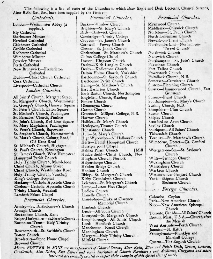 Carson, Patrick. Thomas Potter: Victorian Craftsman, 1804-1895. 2 Vols. Privately printed, 2018. [Source of the list shown above, presented with the heading quotation as an advertisement.]