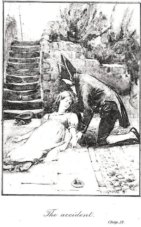 In Chapter 11, the Musgroves visit Lyme. Here, as the illustration shows, Louisa, one of Mary's sisters, after walking on the beach before breakfast, suffers a severe fall. After jumping from the top of the Cobb and down the stone steps wall, the headstrong Luisa, despite Captain Wentworth's warnings, jumps a second time, but her companion fails to "catch" her. The accident constitues a sort of climax since it brings Anne and Captain Wentworth, her former fiancé, together in a crisis, which makes them realize that they still have romantic feelings for each other.