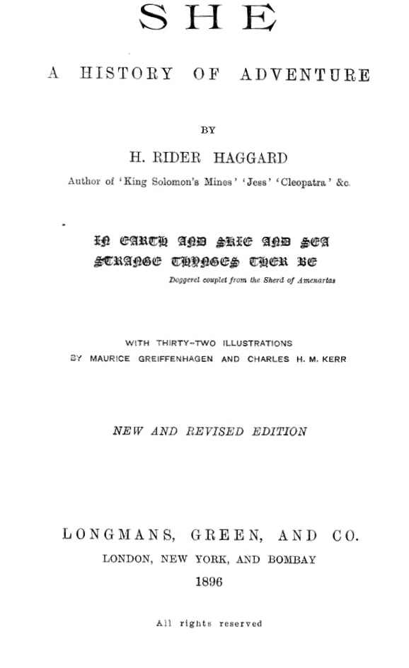 Haggard, H. Rider. SHE: A History of Adventure. Illustrated by Maurice Greiffenhagen and Charles H. M. Kerr. London: Longmans, Green, and Co., 1888, rpt. 1896 [with additional illustrations] and 1927.