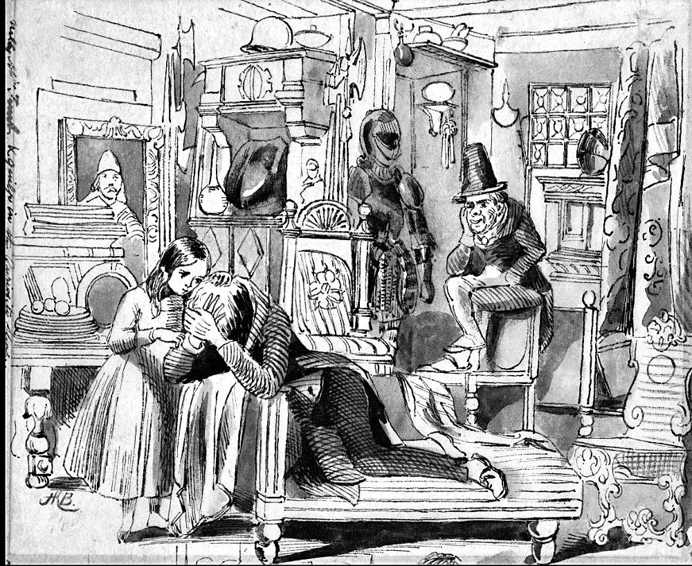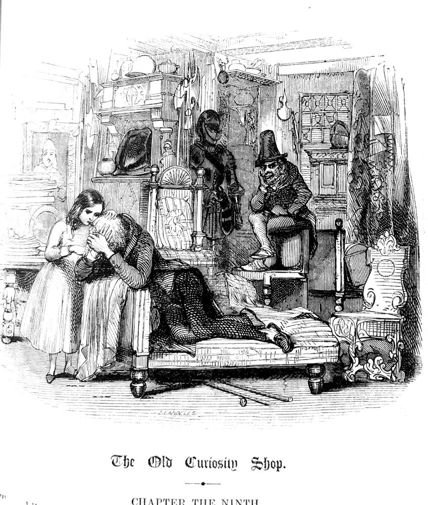 Right: George Cattermole's original print from wood-engraving positions Quilp well in the background as the hideous dwarf observes Nell comfort her grandfather in the curiosity shop; see also Harry Furniss's reinterpretation which foregrounds the observer, Quilp watches Nell comforting her Grandfather (1910).