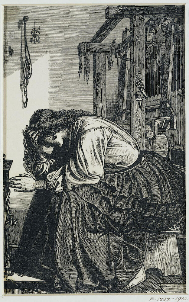 This hard-hitting image closely reflects the influence of Rossetti’s monumental female figures of the 1860s. Here, however, Sandys uses this visual type to make a political point on the effects of privation - the very reverse of Rossetti’s dreamy escapism. The composition also reflects the influence of Rethel and ‘German wood-cuts’ (as wood-engravings were known at the time) in general. The artist’s monogram, placed on the wall facing us, is intended to invoke the spirit of the greatest German wood-cut artist, Dürer, and is based on Dürer’s signature.