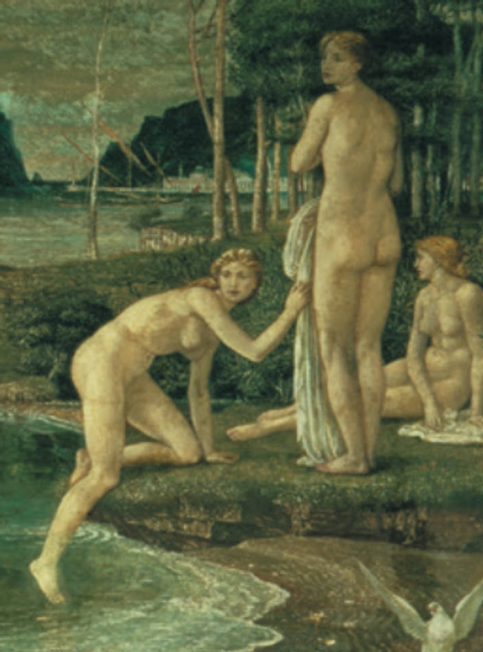 Crane exhibited this painting at the first Grosvenor Gallery exhibition in 1877, no. 70, and then later in the English Fine Arts Section of the Exposition Universelle held in Paris in 1878. This work has long been considered to be one of Crane's masterpieces and was his first large-scale painting dealing with a classical subject. When the painting was exhibited at the Grosvenor Gallery in 1877 it was hung in a fairly good place in the large west gallery, near a group of paintings by Edward Burne-Jones. Spencer has suggested a reason for Crane choosing this subject: "He believed that the idea of beauty re-born was relevant to his own time and that society was about to witness a revival of culture such as had been experienced only at rare moments in its history. One such period was the Italian Renaissance which Victorians were becoming increasingly aware of through the work of historians and connoisseurs such as Burkhardt, Crowe and Cavalcaselle, and Pater" (74). Crane's friend and patron J.R. Wise had seen a coloured sketch for the picture and offered to secure Crane against loss in order to enable him to complete the large picture. Wise therefore advanced him part of the price of the picture on the understanding that if a purchaser came forward when the picture was exhibited then the money would be returned to him. In 1882 the painting was bought by G.F. Watts and in 1913 it was given by his widow Mary Seton Watts to the National Gallery of British Art, now Tate Britain, in accordance with her husband's wishes.