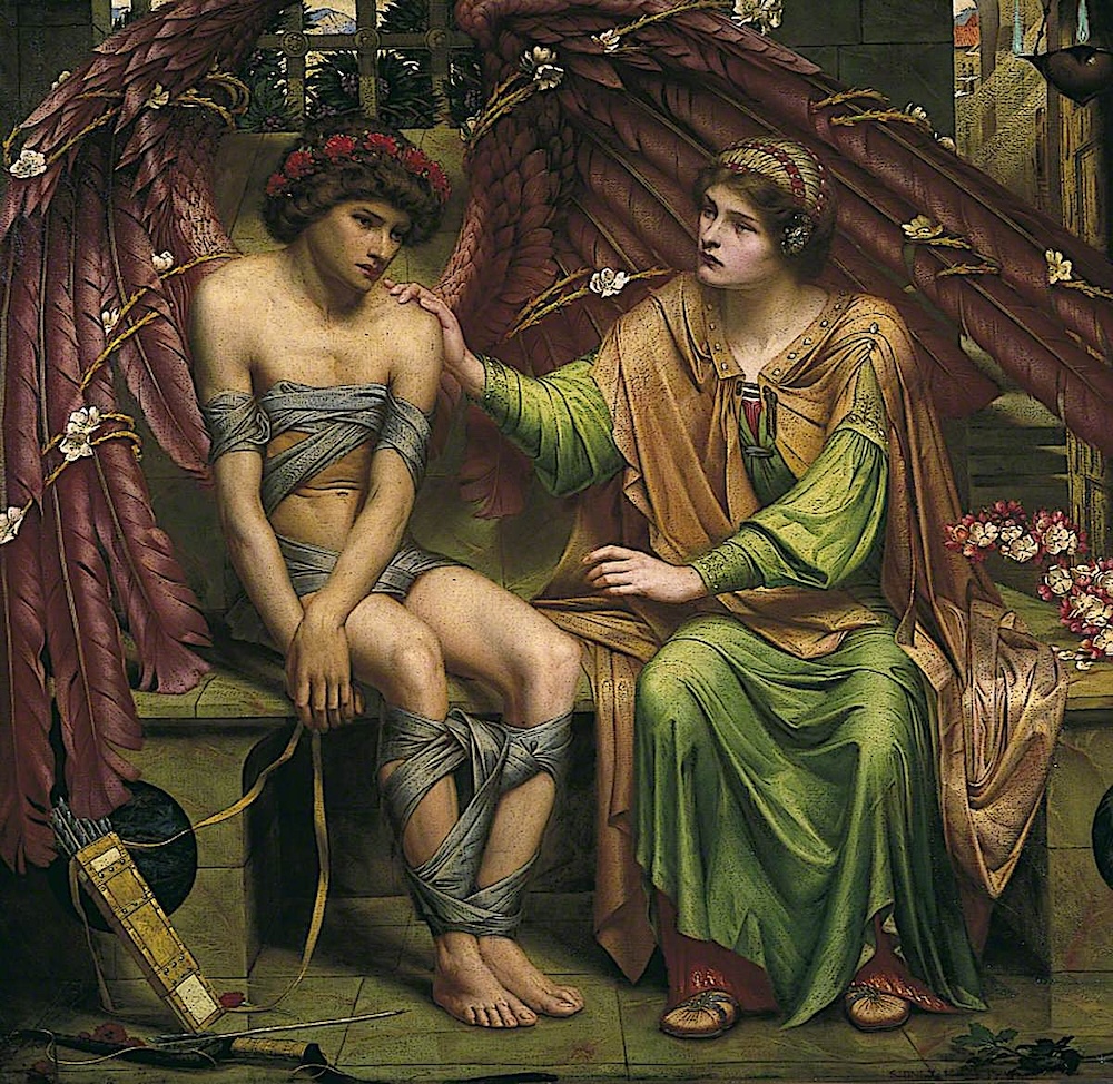 Hope Comforting Love in Bondage, by Sidney Harold Meteyard (1868-1947). 1901. Oil on canvas. 41 x 43 inches (104.2 x 109.2 cm). Collection of Birmingham Museums and Art Gallery. Image courtesy of Birmingham Museums Trust under the terms of the Creative Commons Zero licence (CCO). [Click on the image to enlarge it.]
