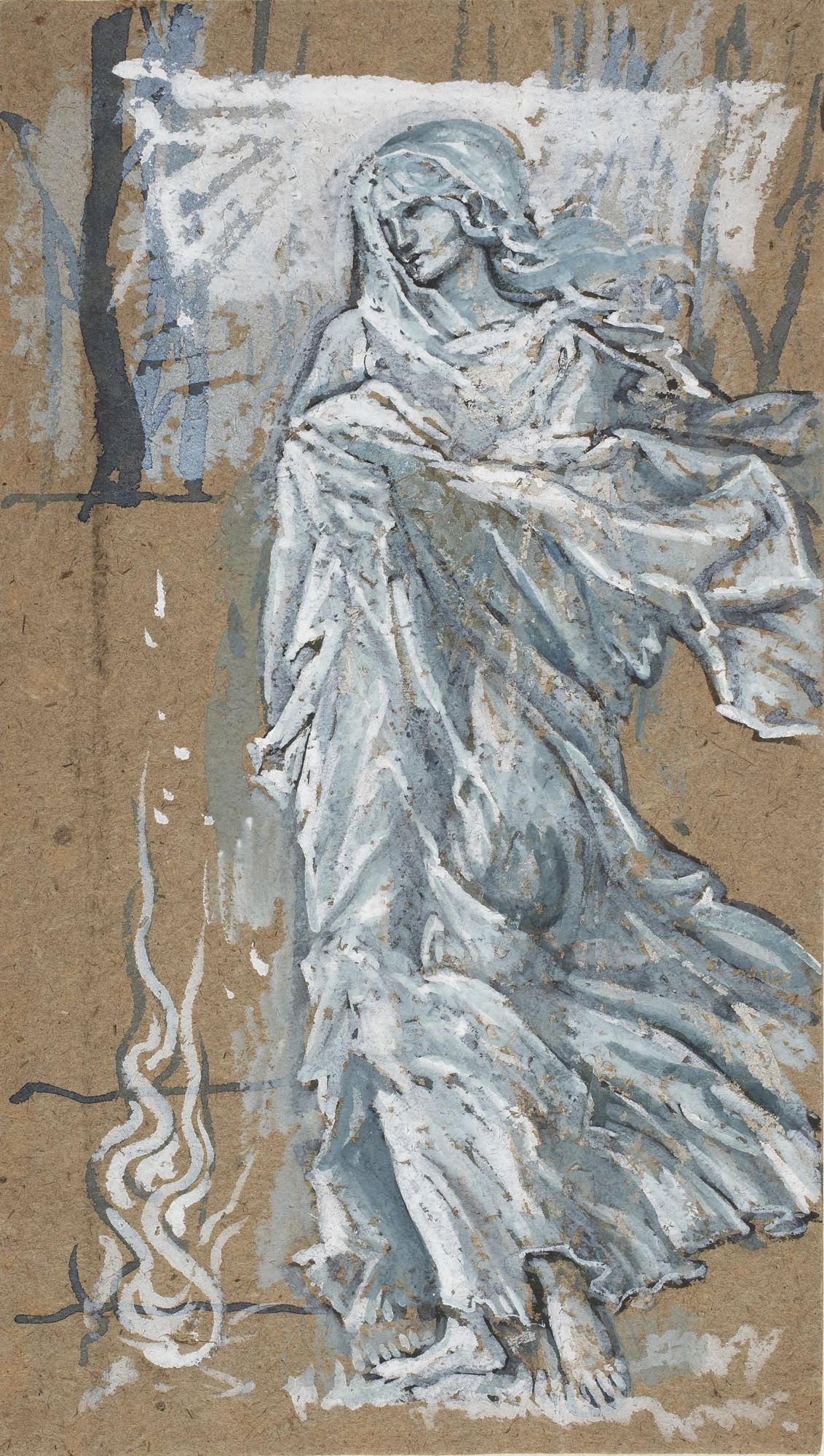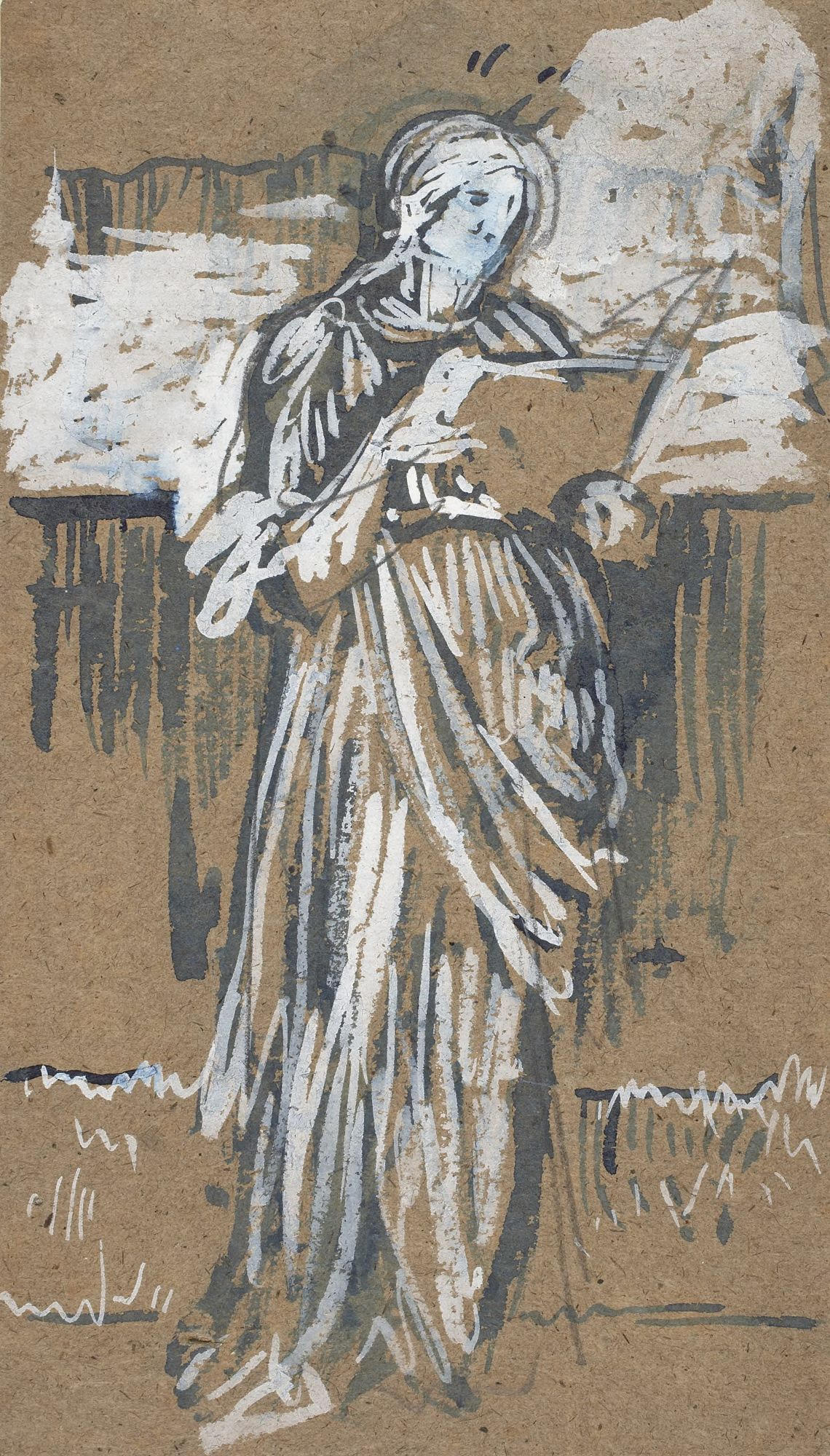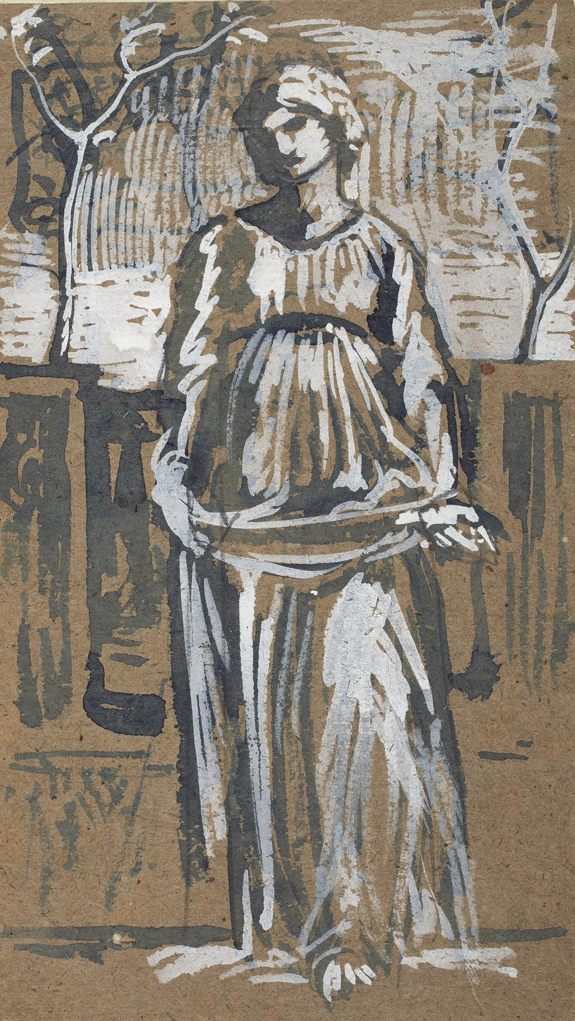 There are a number of studies for The Four Seasons in the collection of the Princeton University Art Museum, including the four studies above, in blue and white wash with pencil on brown paper [object nos. x1948-1452 to 1455]. The figures in the final composition resemble but do not follow exactly the composition of these preliminary drawings. Princeton also owns a pencil drawing for the figure of Summer [object no. x1948-1511]. Murray's oil painting of the left-hand figure for Spring, entitled A Woman in Green Drapery, sold at Christie's, London, on 14 July 2022, lot 42, is shown on the right just below the series at the top of this page. In addition to Spring in The Four Seasons, this painting of an unidentified female subject closely resembles the decorative panels Murray painted for the Green Dining Room at the South Kensington Museum (V&A). This room, decorated in 1866-67, was one of the first major commissions for Morris, Marshall & Faulkner & Co. A Woman in Green Drapery also resembles the decorative panels for painted furniture that Murray did for the firm of Collinson & Lock in the 1870s.