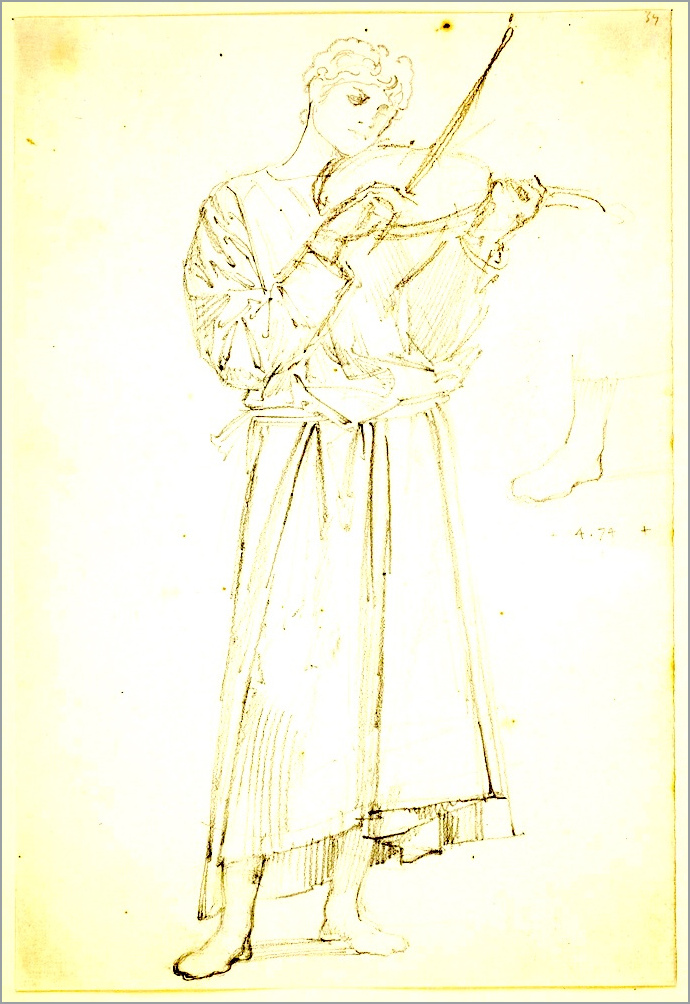 These are two studies for the painting in the collection of the Princeton University Art Museum, both pencil on paper: a sketch of the violin player, 9 7/8 x 6 3/4 inches (25.1 x 17.1 cm), object no. x1948-1474; and of the standing female figure, 10 1/16 x 4 1/2 inches (25.5 x 11.4 cm), object no. x1948-1495. Princeton also has an early compositional drawing featuring two young male violin players that probably relates to this painting [object no. x1948-1408].