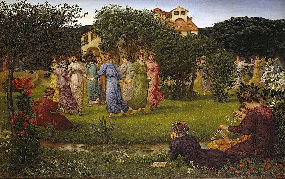 Despite the beauty of this work Rooke did not exhibit it at either of the principal London venues of the time, the Royal Academy or the Grosvenor Gallery. This idyllic scene features two groups of maidens in classical costumes in the midground who dance in a circle holding hands in the yard of a grand house. Some of the dancers face inwards towards the circle while others face outwards towards the spectators. In the left foreground a girl dressed in a dark red gown plays on a pipe. In the right foreground two seated young women construct a daisy chain next to a clump of white lilies, while a young girl who was lying down reading an illuminated book pauses to observe the dancers. In the language of flowers white daisies signify purity and innocence while white lilies signify a chaste life. This group of young women is separated from the dancers by a narrow stream. In the background is an Italianate-style villa surrounded by trees and with low hills in the background. By 1882 Rooke had already made a number of visits to Italy on behalf of his patron John Ruskin so he would have been very familiar with such architecture and landscape.