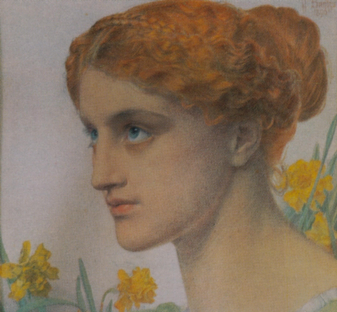 In Betty Elzea's words: "Bust of a young woman facing half to left, with her eyes turned slightly upward. Her wavy hair is dressed up in a bun at the back of her head. She wears a gauzy dress with puffed sleeves and a square neckline. Double-petalled daffodils fill the immediate background to the left and the right of the figure" (283). The daffodils were likely included purely for decorative purposes. In the Victorian language of flowers double-petalled daffodils were frequently associated with unrequited love or grief.