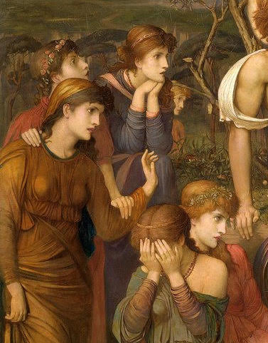Left: The various expressions of Strudwick's Muses. Right: The vulnerable Marsyas, not at all satyr-like in Strudwick's version, as the flute falls from his hand.