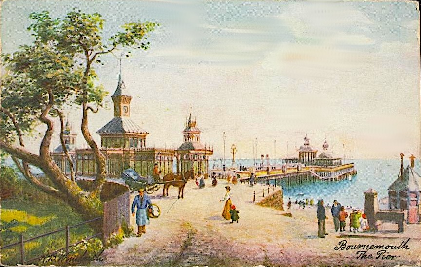 This fine late-Victorian structure was appropriate for the high-class resort that Thomas Hardy christened "Sandbourne" in several of his novels: it is, for example, the fashionable seaside town in which Angel Clare finds Tess living with Alec d'Urberville towards the end of Tess of the D'Urbervilles (Ch. LV). However, it was replaced later, most recently in 1981. Today's pier-entrance building, an entertainment complex and events venu, projects quite a different atmosphere, as do the covered rock-climbing facility and other allurements offered at the seaward end of the pier.