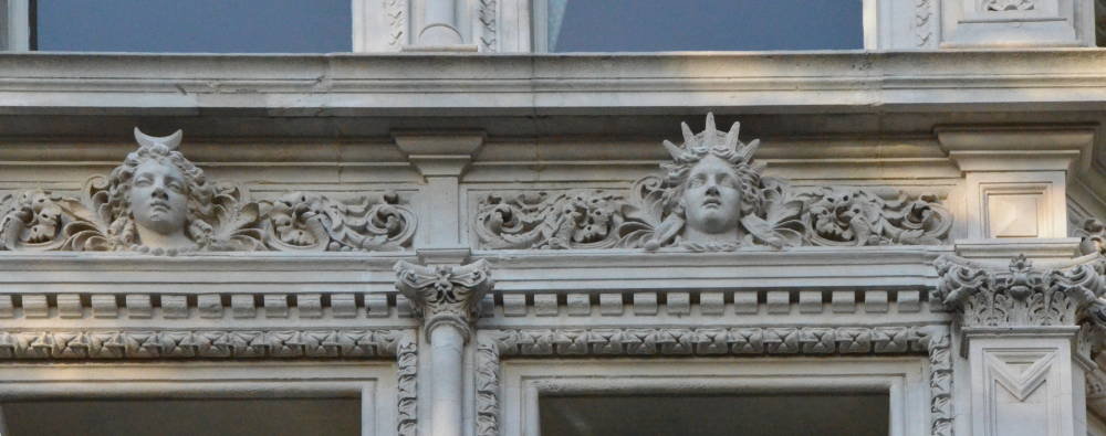 Left: Medallions with women's heads in high relief on the side and front of the pilasters above the archway. Right: Two heads on a frieze between windows. The latter must be (on the left) Diana with a crescent moon, and (on the right) her twin brother Apollo, the sun god.