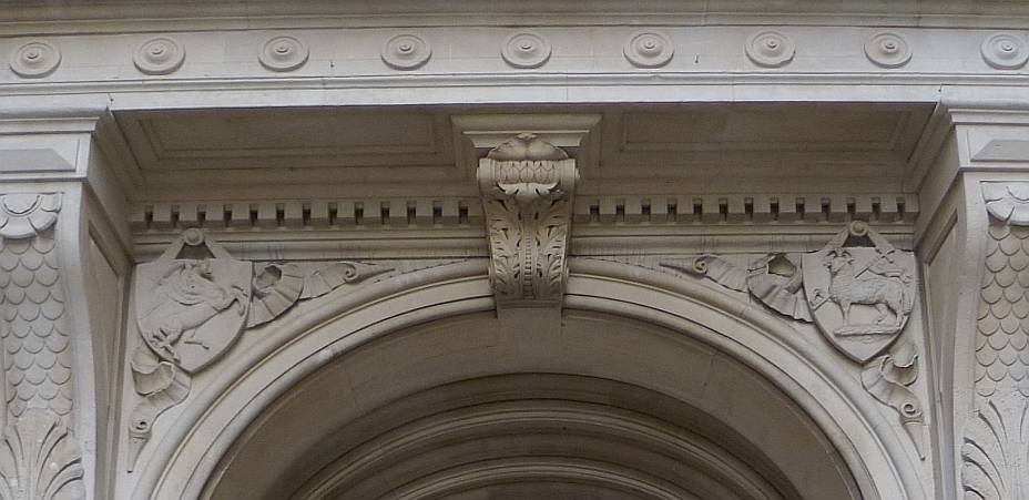 Left: The other side of the archway. This is much plainer than the Gardens side, but has shields showing Pegasus on the left, emblematic of the Inner Temple, and a lamb and flag on the right, emblematic of Middle Temple. The Temple Gardens buildings are the only ones shared between both Inns of Court. Barry had been appointed by the Inner Temple, and J. P. Aubyn, who had also been involved in the 1860s restoration of the Temple Church, was the surveyor/architect for the Middle Temple, with whom Barry consulted. Right: Entrance to 1 Temple Gardens. The initials WHC above the door stand for William Henry Cooke, treasurer at the time of construction. This is the more intimate side of the archway.