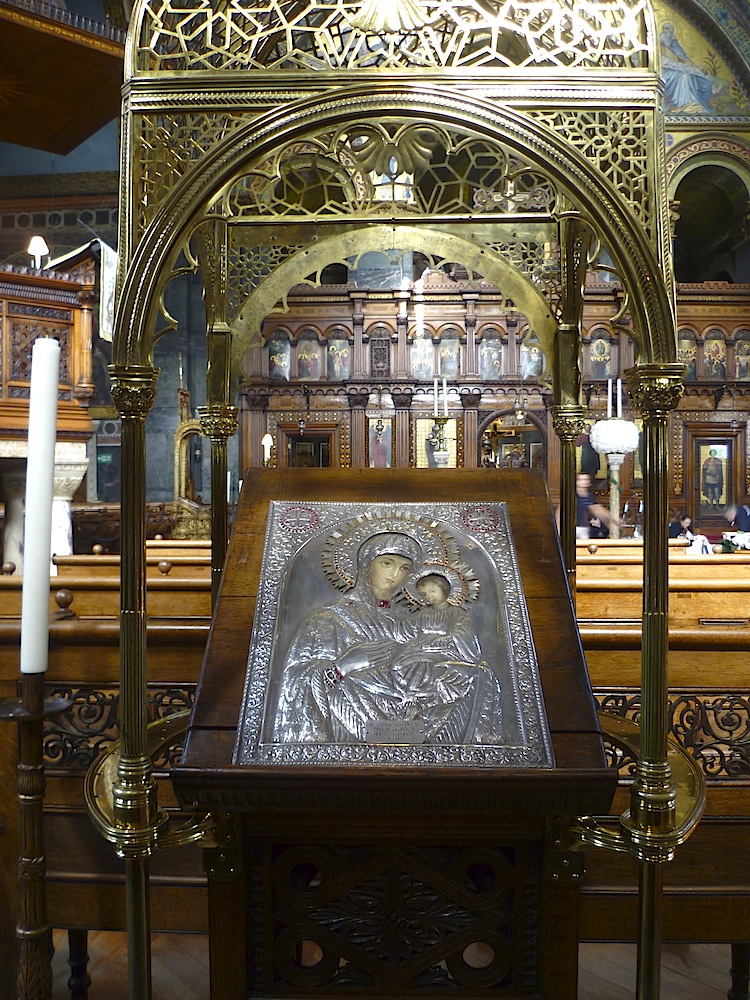 Of the fixtures and fittings, the List Entry says, "many purpose-designed for the church, and all of the highest order of craftsmanship." How appropriate this is, in view of the fact that Sancta Sophia became a Greek Orthodox Cathedral in 1922, "with jurisdiction over all Orthodox Christians in Western Europe," and in World War II served as the Cathedral Church "of the entire Greek nation" (Davies 410). It is important to remember as well that this expatriate community has made great contributions to its adopted country. Below right is shown one of the very beautiful mosaic and marble memorials in the church. It is to two brothers from the Anglo-Greek community, Michael and Cyril Spartali, who died in action while serving in different British regiments in World War I.