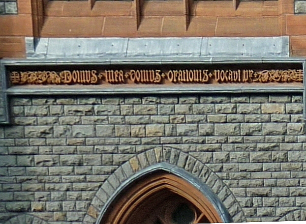 Edward Pugin had died in 1875, and Cuthbert Pugin was more concerned with the furniture side of the enterprise, so Pugin's youngest son Peter Paul would have been responsible for the design. In fact, St David's is typical of his work at this time. Having moved gradually away from his father and brother's influence, he now demonstrated "a very recognisable curvilinear Gothic style, usually in red sandstone with elaborate altarpieces in coloured marbles" ("Peter Paul Pugin"). The interior of this church had to be reconstructed after the war, but the building was "externally very little altered" (Newman 192). It has a striking presence, rising sheer from the street with delicate window tracery and a text just under the west window reading: "Domus mea domus orationis vocabitur" (My house shall be called a house of prayer).