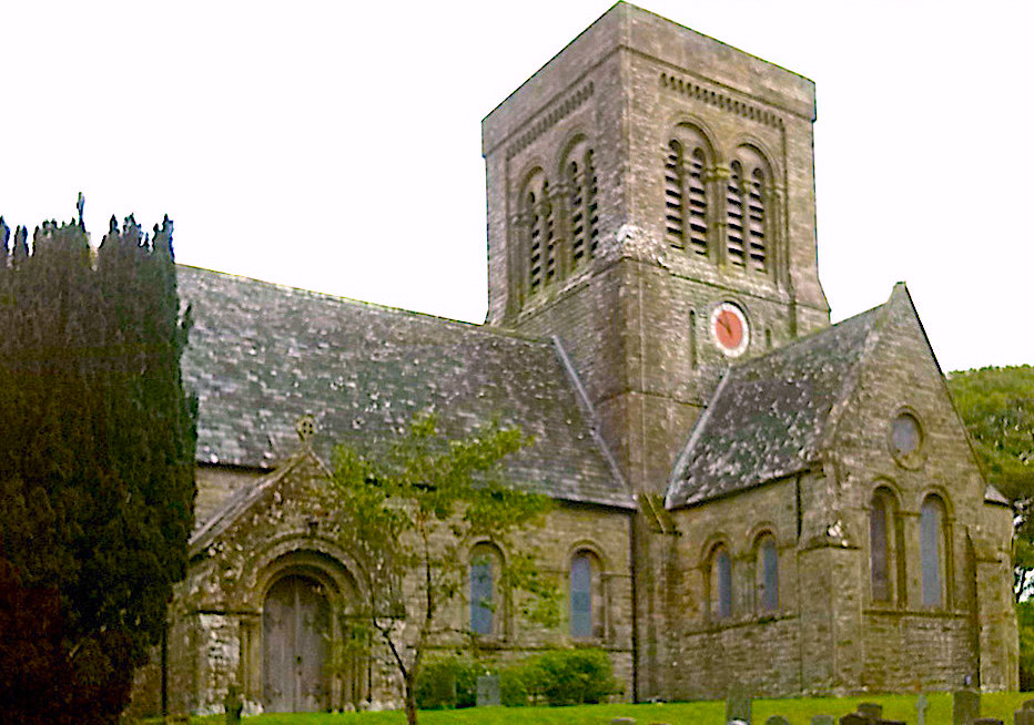 St Bridget (which has also been known as St Bride), Bridekirk, near Cockermouth, Cumbria is a Grade II listed church designed by the Carlisle architects, John A. Cory (1819-1887) and Charles John Ferguson (1840-1904) in 1868, and completed in 1870. The listing text describes it as being constructed of "[r[ock-faced calciferous sandstone"with a "[g]raduated greenslate roof." The most striking external features are the powerful square tower at the crossing, the buttresses, the round-headed windows and the looming apse similar to the one at Ferguson's church at Tebay. Ferguson "excelled" in this Neo-Norman or Romanesque-Revival style (Hyde and Pevsner 183).