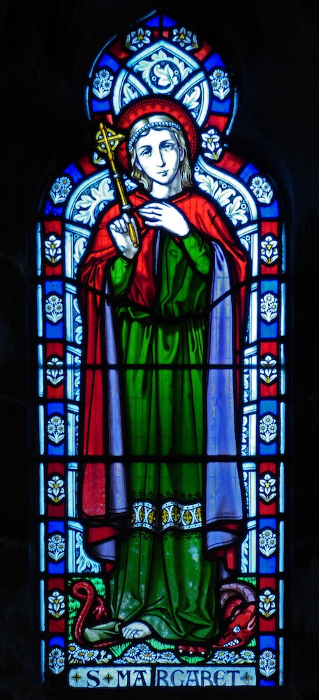 As for the porch windows shown above, these were installed in about 1860, but are unattributed. They depict the saints to whom the church is dedicated. St Margaret of Scotland, treading down the dragon, was an obvious choice for a church commissioned by Lady Margaret. St Kentygern, also known as St Mungo, was venerated in Scotland too, but pursued his missionary activities in and around Cumbria (the 16th Baron Willoughby had died in Warwickshire) and is said to have visited Wales as well (see Cohn-Sherbok 168).