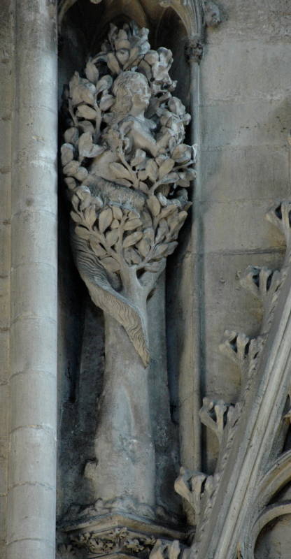 Left: Woman (Eve? Lucifer in disguise? Mary in a Jesse tree?) in leaves. Middle two: Two views of statues n niches and elaborate carving over doors. Right: Capital with head of man.