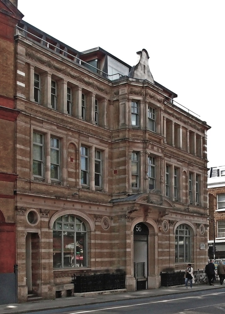 English Renaissance [style].... The builder was Mr. H. L. Holloway, of Deptford. The carving, designed by the architect, was exceedingly well executed by Mr. Baird, of 8, Heron Road, Herne Hill. The keystone to the principal entrance in Southwark Bridge Road is enriched by the head of Minerva, the Goddess of Wisdom (Southwark Annual for 1895). [Commentary continues below.]