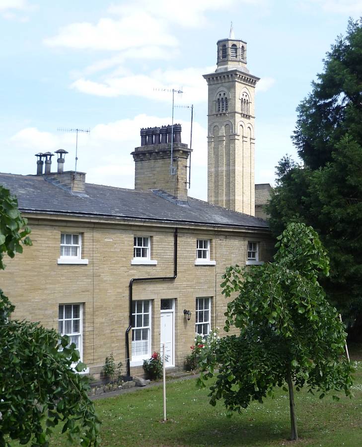 The former almshouses. In all, the model mill-town of Saltaire, designed by Lockwood & Mawson from 1853-1868, had "twenty-two streets, besides places, terraces, and roads, which contain 850 houses, and forty-five almshouses, making a total of 895 dwellings, covering an area of twenty-five acres" (Balgarnie 136). The almshouses are, in a sense, showpieces. They are on both sides of Victoria Road, the main road to the mill, before it reaches the major public buildings, that is, the former Institute and Factory School. One group is on the west side, and the rest are on the east side, the hospital standing at their north-east corner. Presenting themselves to the visitor early on, they form the most picturesque development in Saltaire. There are in a slightly different stone and style to the rest of the houses — along with the hospital, they are in a "busy rock-faced Trecento" (Leach and Pevsner 682), that is, the warm-coloured stone here is more textured and the style is more distinctly Italianate. There is a pleasing variety: "The houses are one and two storeys in height with alternating gables and entrance bays" ("Saltaire: Conservation," 30). Their purpose also makes them quite remarkable for their period. Here, each inmate lived rent-free on an allowance of 7s.6d. per week, "the married couples, who are not separated in their old age, being allowed 5s. extra" (Great Industries, p. 85). There was a little chapel for those unable to walk far enough to go to church — and all this forty years before there was any such thing as a state pension ("Discover Saltaire"). Four of the almshouses were later incorporated into the hospital.