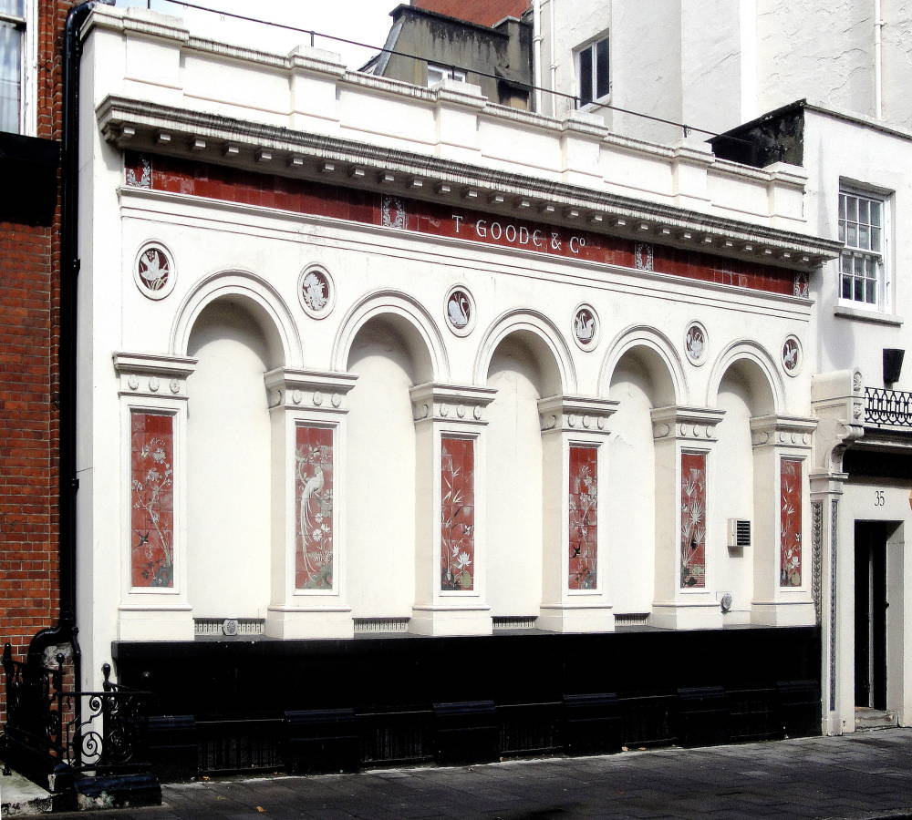T. Goode & Co (1875-76, rebuilt in 1890-91). Listed Building. Harold Ainsworth Peto (1854-1933) and Sir Ernest George (1839-1922). Location: 17A and 17-22 South Audley Street (including 35-35A South Street). According to volume 40 of The Survey of London, on South Street the building “has 1 storey wing stuccoed with blind arcade framing panels of Aesthetic-Japanese style ceramic tiles appropriate and original, as are the vases on the façade. The 3 storey 3 window wide stucco elevation beyond is a mid to late C.18 house incorporated at the time into Goode's premises.” (Quoted on the British Listed Buildings site).
