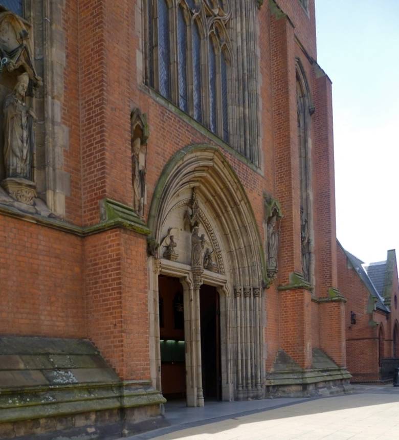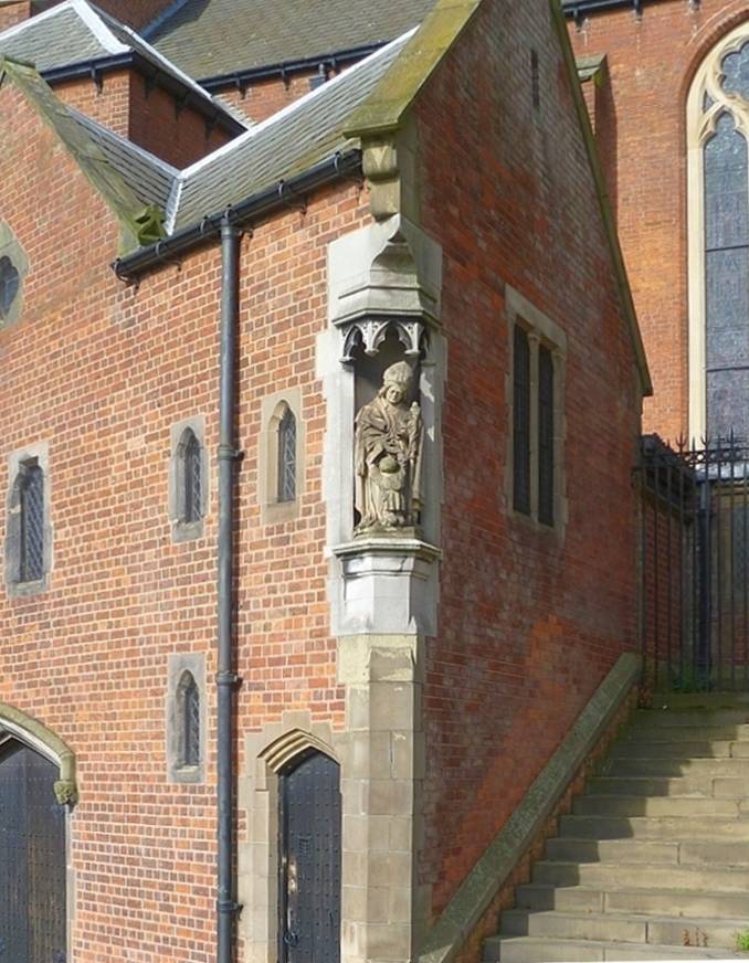 Left to right: (a) The edge of the extension housing the crypt entrance, intended for a school. The crypt was dedicated to St Peter. ( (b) Statue of a bishop on the angle of the building, possibly Bishop Walsh (who was also clean-shaven, is buried within, and has a fine monument in the church itself) looking down compassionately at a kneeling boy. (c) Closer view of bishops on the right-hand side, that is, Wulstan, Thomas à Becket and Hugh of Lincoln, their hands raised in blessing.