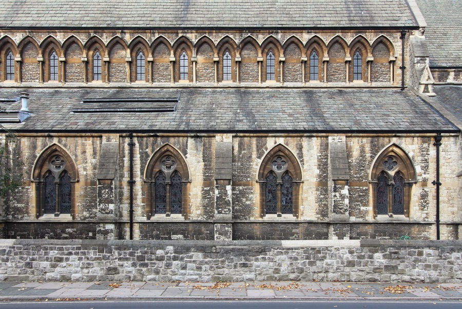 Label stops carved as welcoming faces on the outermost arch of the west entrance. One looks like a Carmelite nun (as the name of the road suggests, in medieval times there was a Carmelite convent in this area); the clergyman may resemble the Reverend Dupuis himself.