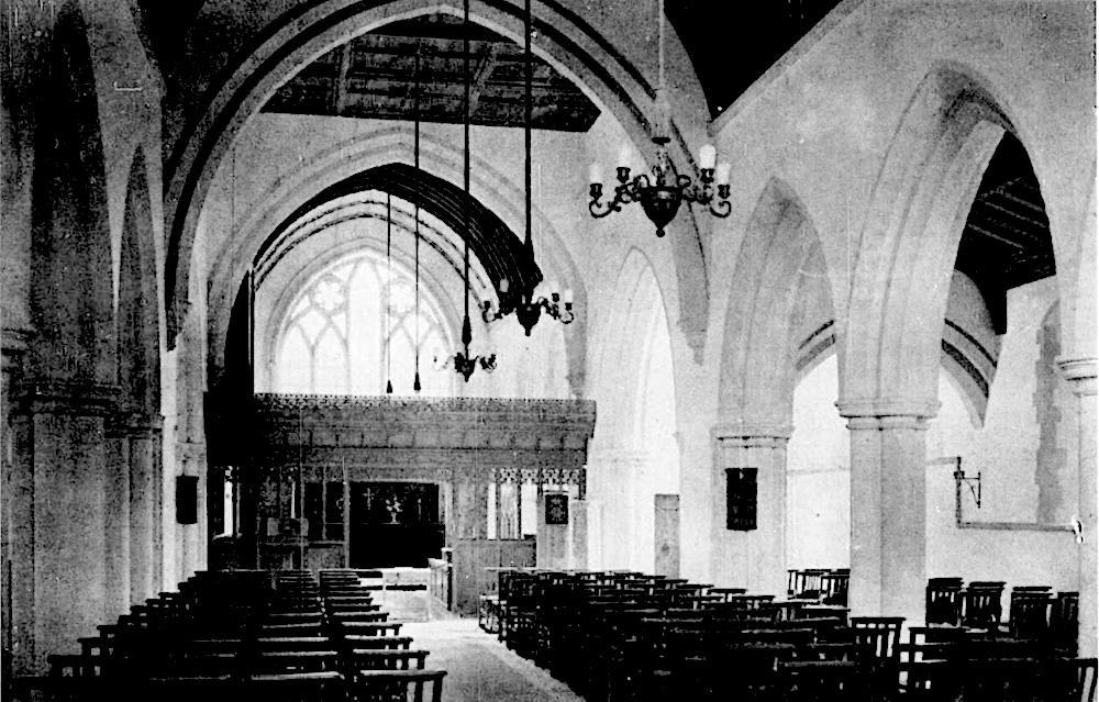 The interior is similarly unfussy, but the listing text does draw attention to the kinds of decorative details for which Tapper was known: the painted wood and floral bosses of the chancel roof, and the painted organ. Noted elsewhere is something else that speaks of his Arts and Crafts allegiance: "a beautiful oak chancel screen richly carved with foliage" (Mee 319).