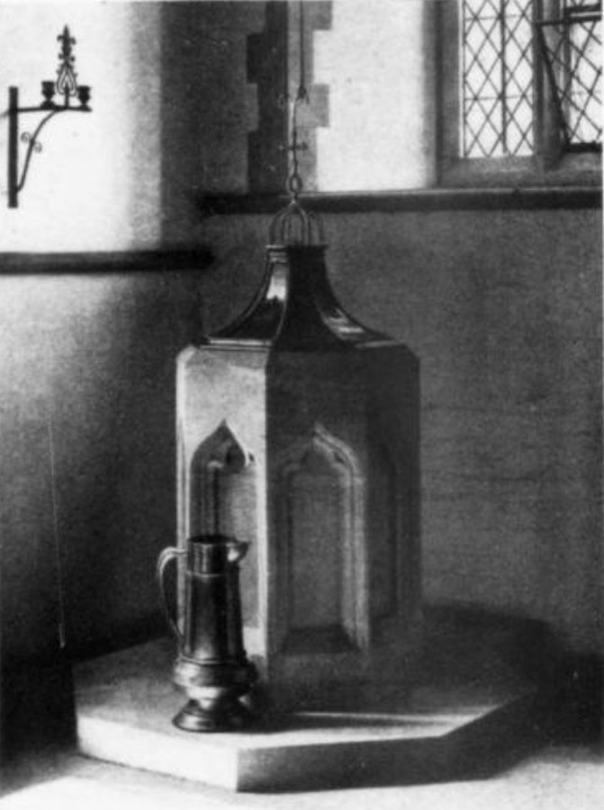 The elegant sandstone font, described in the listing text as "[o]ctagonal ... with ogee head panels below, metal tent shape cover above" (listing text) has a more modern, streamlined feel to it, but otherwise everything, such as the sedilia and piscina on the south wall, is in harmony with the Gothic exterior. The choice of style here is particularly interesting in view of the fact that the Gothic has been eschewed in other communal buildings, such as the village hall and club-house, and indeed in the village as a whole: Ian Nairn and Nikolaus Pevsner call it "the only Gothic effort in a composition otherwise keeping away from medieval precedent" (520).