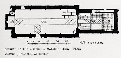 The Church of the Ascension, Leigh Sinton Road/Somers Park Avenue, Malvern Link, Worcestershire, was designed by Walter J. Tapper (1861-1935) as a chapel of ease for the parish, and erected in memory of Archdeacon Livingstone of Sudbury, who had died of pneumonia at the end of 1902. It was the first church that Tapper put his own name to, after years of working with G.F. Bodley and Thomas Garner. Completed in 1903, is a Grade I listed, with stout walls of warm, honey-coloured Guiting stone with Bath stone dressings. Its general impact is summed up by Nikolaus Pevsner: "Unassuming exterior and interesting interior" (166).