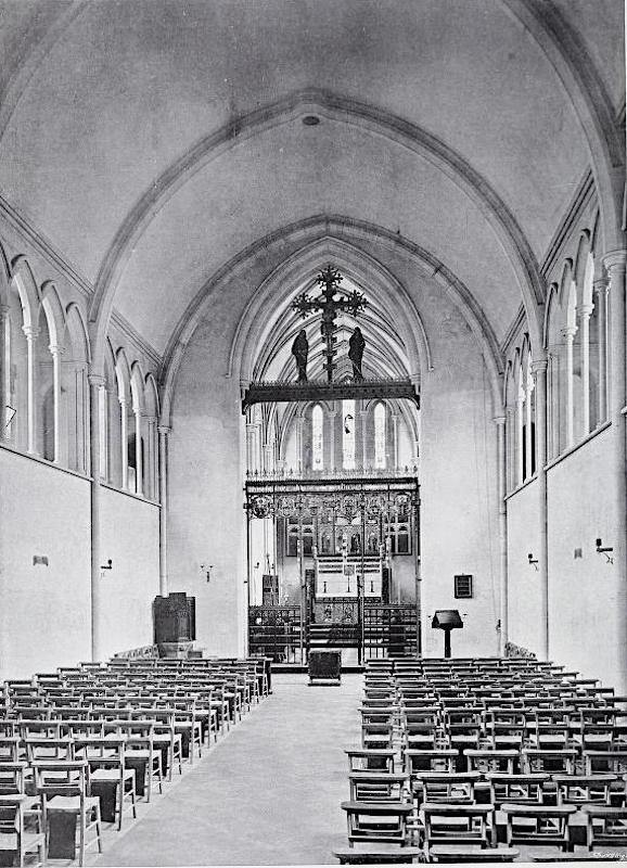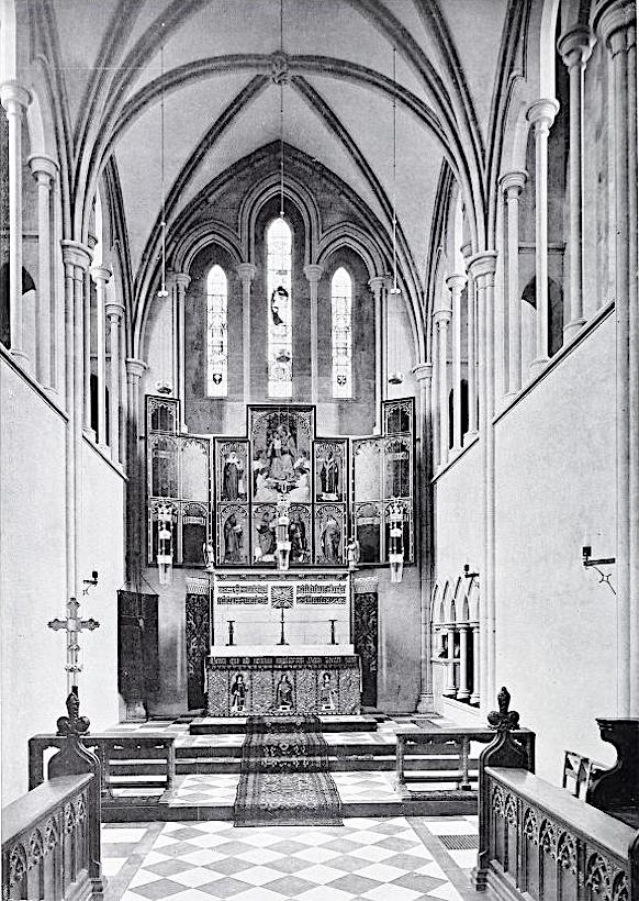 The perception of height continues inside, with a narrow gallery running along the clerestory windows, a tunnel-vaulted nave; and a rib-vaulted chancel. Pevsner himself describes the ironwork screen as "[h]igh," and as being "attractively designed" by William Bainbridge Reynolds [Pevsner gives Reynolds the initial "G," but other sources, such as John Dixon (8) correctly, have "W" as the initial]. Appropriately enough, the East window of Tapper's church, designed by Henry Victor Milner (1866-1944) of Haverstock Hill, London, depicts the Ascension. Below it, placing the church within the select cadre of High Church masterpieces, is a triptych described in the Architectural Review as "depicting the Child Christ on the knee of His Mother, with four attendant worshippers, and in the six other panels are figures of Saints Patrick, Etheldreda, Hugh, Edmund the King, Frideswide, and the Venerable Bede..." — the work of "Sister Catherine Ruth of the All Saints Community, Margaret Street, London" (187).