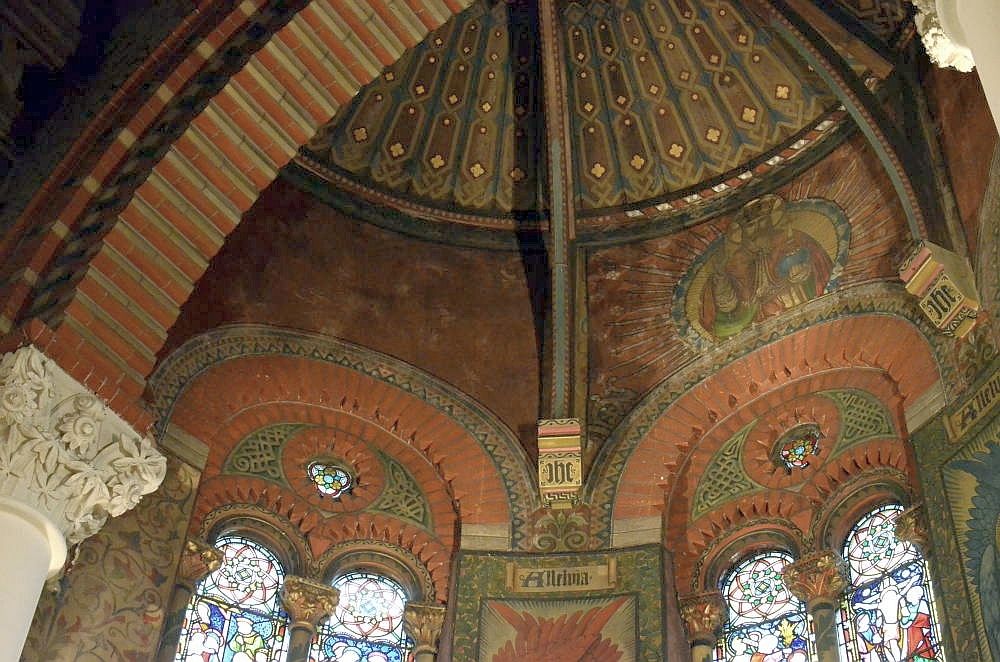 Left to right: (a) The chancel viewed from the nave. (b) The chancel viewed from the gallery. (c) Teulon's arcades and Salviati mosaic work at the side of the chancel. Teulon was responsible for the general structure of the east end of the church, also for the dazzlingly polychromatic brickwork and (in the picture on the right) the brilliant mosaic inlays with which he adorned the chancel. The mosaics, of Venetian Salviati glass, certainly helped to create the effect of a "glittering Byzantine temple" to which he aspired (qtd. in A History, p. 9). Other decorations were added later. These include the paintings on the apse wall. The seraphim between the west windows, seen left and centre here, were painted on canvas by a local artist, George Ostreham, and added in 1892 "as part of a thank-offering for Queen Victoria's long and happy reign" ("Tour," p.3).