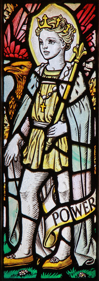 The seven replacement baptistry windows. Although not the original ones, these are of interest because they were designed by James Hogan (1883-1948), working for the long-established firm James Powell & Sons — whose stained glass studio closed only in 1973. The youthful angels walk on grass studded with daisies. Symbolic details, such as an eagle in the one representing power, and an owl in the one representing wisdom (fourth and fifth from left) contribute to their meanings.