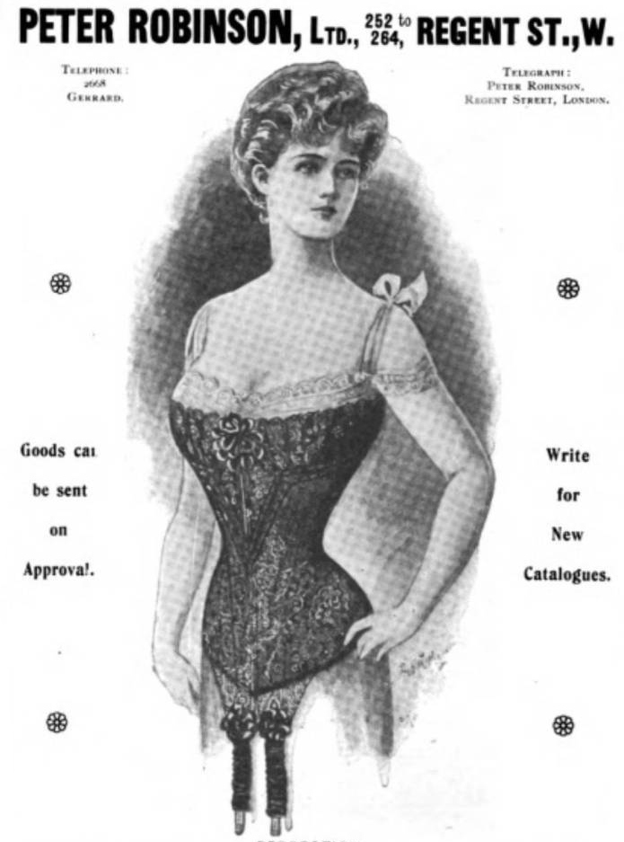 Filomena opens her “Ladies’s Page” column for October 1902 by praising turn-of-the-century women’s clothing for being so much more sensible and healthy than were the fashions of the eighteenth- and nineteenth-centuries. But even a quick glance at the illustrations of wasp-waist outfits that accompany her column, much less the undergarments required to be able to wear them, make her remarks seem paradoxical. Does “Filomena” only mean that corsets that create tiny, unnaturally small waists, such as the one pictured below, are comparatively healthier than earlier corsetry that constricted a woman from armpit to hips, or does she accept that undergarments advertised in 1902 are themselves perfectly healthy? Given the puffery for costume jewelry sold by a particular London firm that follows this discussion in her column, it is certainly possible that “Filomena” refrains from criticizing firms that advertise in Illustrated London News.