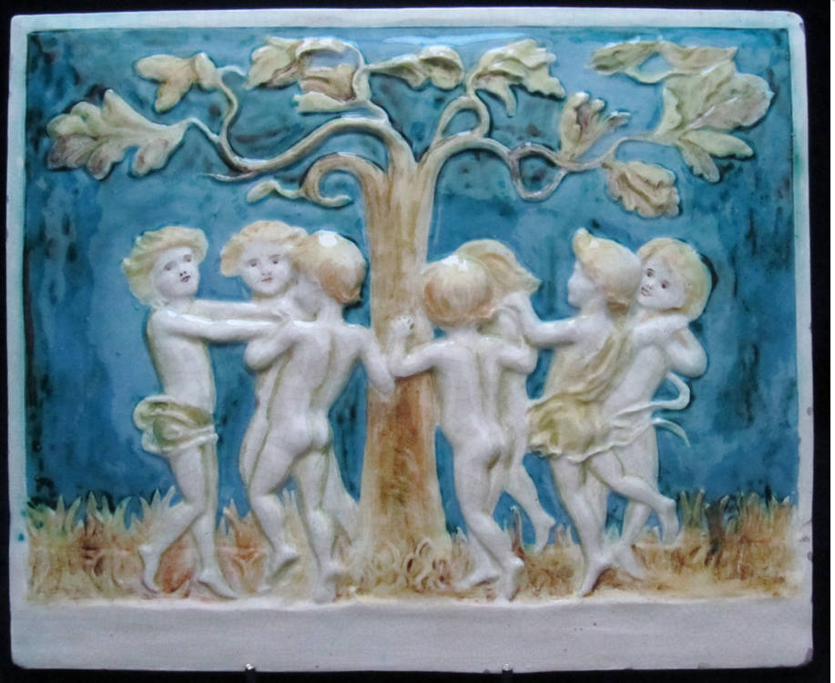 Della Robbia Plaque decorated in relief with a group of Dancing Children. Della Robbia, manufacturer; designer, Ellen Mary Rope (see note below); potter, Miss M Furniss, c. 18941900. 8 x 9.75 x 3/4 inches deep. Collection: AD Antiques Ltd. [Click on image to enlarge it.]