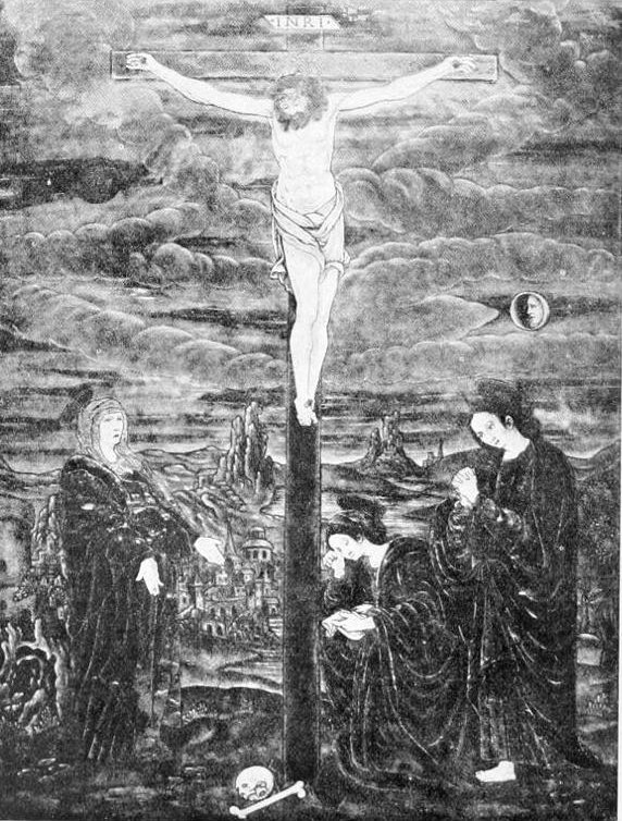 Left Altar Cross in copper gilt with champlevé enamels Rhenish-Byzantine. Twelfth century. Right two: Small Crosses in transparent and opaque cloisonné enamel. Tenth or eleventh century. “In the South Kensington Museum” — i.e, the Victoria and Albert Museum.