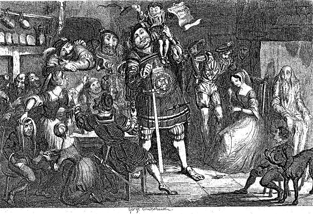The Stone Kitchen — George Cruikshank. January 1840. The third steel-engraving and eighth illustration in William Harrison Ainsworth's The Tower of London complements the architectural study of the vacant room as it existed in 1840, The Stone Kitchen. framed. Among the crowd enjoying the warm, food, drink, and comraderie are the three jovial warders Og, Gog, Magog ("the Three Giants of the Tower") and their friend, Xit the dwarf. 9.6 cm high by 14.6 cm wide, facing p. 28. [Click on the image to enlarge it.]